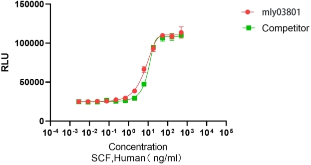 Recombinant  Human  SCF  (Cat. No.mly03801)  stimulates proliferation  of  TF-1  cells.  The  ED50    for  this  effect   is 5-8ng/mL. The  activity  of mly03801 was  higher  than  other competing products.